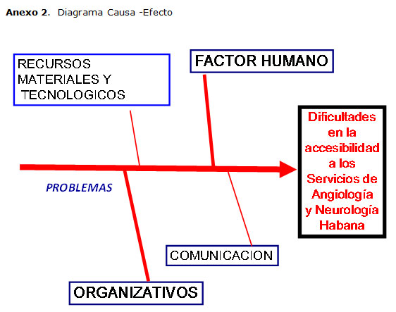 Una vez que fueron listados y agrupados los problemas se confeccionó un diagrama Causa- Efecto en el seno del colectivo de expertos (Directivo del MINSAP, autores , jefes de servicios de los hospitales de ambas especialidades, funcionarios de las direcciones de salud de las provincias La Habana, Mayabeque , Artemisa y de la Atención Primaria) donde el problema principal fue la deficiente accesibilidad de la población a los servicios médicos y en el resto del diagrama se colocaron las principales causas por orden de importancia.
