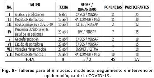Todo este quehacer ha tenido como marco el Simposio para el modelado, seguimiento e intervención epidemiológica de la COVID-19 , que ha contado hasta la fecha con ocho talleres de análisis y discusión, según muestra la figura 8, con vistas al debate científico y validación de las herramientas utilizadas, para su introducción inmediata.